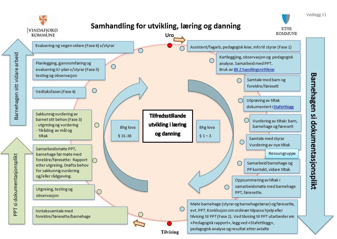 Merknad: Fasen er regulert av barnehagelova §§ 33 og 34. Før tilvising skal saka vera drøfta med foreldre/føresette, vera kartlagt, tiltak skal vera prøvd ut, dokumentert og evaluert. Tiltaka skal omhandla tilpassingar innan opplæring, rammefaktorar og organisering. Foreldre må gje skriftleg samtykke for tilvising til PPT. PPT er sakkunnig instans jf. barnehagelova § 34. Foreldre kan krevja sakkunnig vurdering med sikte på å fastslå om barnet har rett til spesialpedagogisk hjelp.